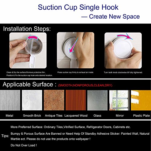 - [Wide Range Applicable Surfaces] - This suction cup works perfectly in smooth,clean and dry ceramic tile,glass,fiber glass,mirror,granite,metal,acrylic,laminate surface and any other non-porous,flat surface with glossy finish.With the help of standby adhesive sticker,you can enlarge the applicable occasions to some bumpy and porous surface.Please refer to more details in the manual along with the product.