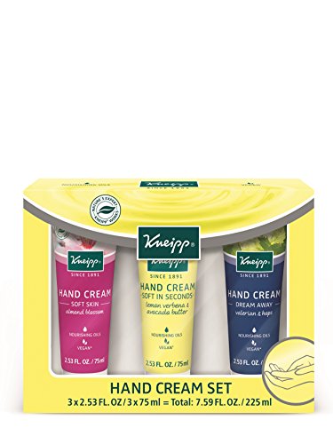 -. Feature : Over 100 years of research went in to perfecting luxury formulas with bold fragrance and nourishing attributes. Our hand creams contain ingredients which bind and retain moisture in the skin. From our Lemon verbana and avocado hand cream that is rapidly absorbed into the skin to our almond blossom hand cream that is ideal as a nighttime treatment as it is slowly absorbed into the skin for lasting protection. / The KNEIPP® ALMOND BLOSSOM HAND CREAM "SOFT SKIN" with high-quality almond oil, shea butter and vitamins A + E protects the hands from drying out and from harmful environmental influences. Absorbs rapidly without greasiness and nourishes stressed hands, making them feel velvety soft. / Velvety hands in seconds. The nourishing, plant-based formula of the KNEIPP® LEMON VERBENA & AVOCADO BUTTER HAND CREAM "SOFT IN SECONDS" with valuable avocado butter, jojoba oil and lemon verbena makes the hands noticeably soft and supple. / The KNEIPP® VALERIAN & HOPS HAND CREAM - "DREAM AWAY" pampers and regenerates your hands overnight. The extra-rich hand cream with the nourishing, plant-based formula of shea butter, evening P.R.Imrose oil, valerian and hops nourishes and protects stressed hands. For soft, supple, smooth hands.