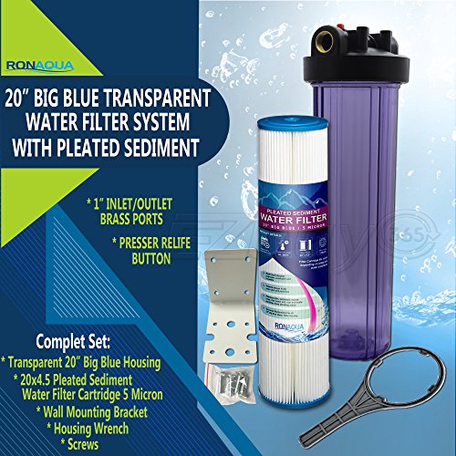 Whole House Water Filter Purifier System, Transparent Big Blue Housing with Presser Relief Button, 1” Inlet/Outlet Brass Port & 5 Micron Pleated Washable Sediment Water Filter Cartridge (20 Inches)