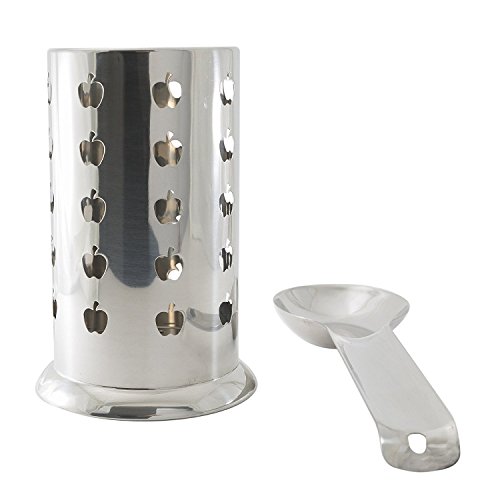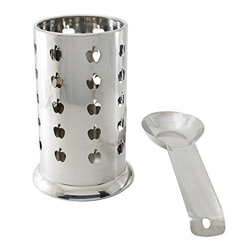 Kitchen Utensil Holder with Large Spoon Rest - Shiny Stainless Steel with Cute Apple Cutouts - 7” Tall and 3.5” Wide (4.75” Base Width)