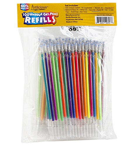 Artlicious - ULTIMATE 100 Unique Gel Pen Refills- Non Toxic & Acid Free - Ideal for Coloring Books