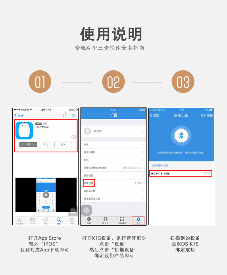 4. Enter the IKOS APP - > Settings - > device in the search to find IKOS (Note: Pairing in IKOS APP, Instead of pairing in iOS devices with Bluetooth!)