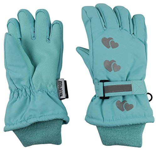 Binding : Apparel Product Description N'ice Caps Little Girls Reflector Cute Hearts Print Waterproof Thinsulate Winter Gloves. For added safety, the hearts designs are made with reflective material that will reflect light when outside in the dark. The gloves are fully lined with 3M Thinsulate insulation and waterproof lining, great for cold temperatures and staying dry in wet or snowy conditions. Full PU sure gripper on palms, fingers and thumbs, and nubuck reinforced thumbs to provide extra grip for outdoors activities. Gloves have elastic under glove wrists for easy-on wear for small hands, and knit cuffs to keep the snow out. Size recommendations and product dimensions (Dimensions: Length is measured from the elastic along the wrist of the glove to the end of the middle glove finger; Width is measured across the palm area of the glove at the widest point) : 3-4 Years (5.25" length, 3.5" width); 4-5 Years (5.5" length, 3.5" width); 5-6 Years (5.75" length, 3.75" width); 6-8 Years (6.0" length, 4.0" width). Available in black, fuchsia, and mint colors. 0