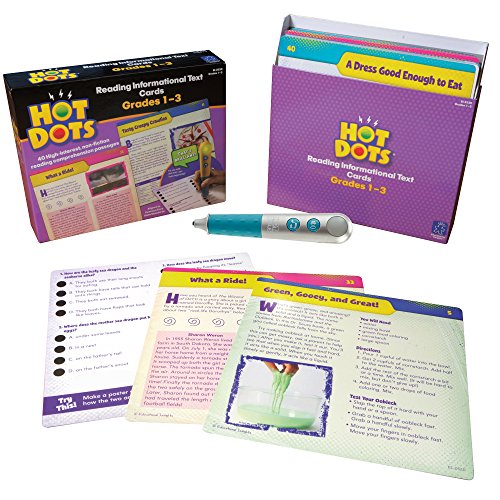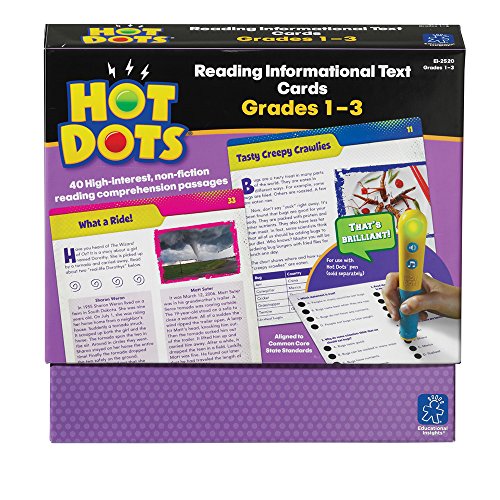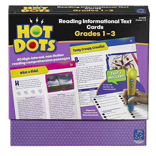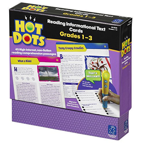 Reading literature and informational text are given equal weight in the new Common Core State Standards. This set of 40 cards includes high-interest, leveled nonfiction passages that help prepare students to be successful in reading and understanding this type of material. The content is cross-curricular—drawn from science, social studies, and math—and each passage includes four multiple-choice questions plus a suggested writing extension activity. For use with the Hot Dots pen (sold separately, requires 2 AAA batteries).Feature