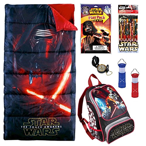 Studio : StarEX Publisher : StarEX Product Description Time To Defeat The Darkside! Perfect Kit For Your Next Party or Adventure Includes: Slumber sack: ? Polyester Shell and Liner ? Triloft II Performance Insulation For Durability ? Full Length Zipper ? Measures: 56" L x 28" W x 3" H Oxford Backpacks: ? Measures: 14"x 9" x 5" ? Adjustable Shoulder Straps ? Hanging Loop ? Mesh Pocket ? Double Zippered Main Compartment ? Secondary Zippered Front Pocket ONE Light Saber Flashlight: ? 1 - Flashlight -- Colors will vary - Blue/Red ? Converts Into a Lantern ? Image of Crossing Sabers ? 3 Different Light Modes (High, Low, Flashing) ? Requires 3 AAA Batteries - Not Included Explorer Compass: ? Foldable Design ? Magnetic Dial ? Navigating Line for Use with Maps 1 - Play Pack Grab Go! Activity Set - Set Contains: ? 25 - Stickers ? 24 - Page Fun Size Coloring Book ? 4 - Crayons 12 - No.2 Lead Real Wood Pencils All Officially Licensed Genuine Authentic Merchandise Perfect For Ages: 4-9 Years Old Tons Of Fun For Sleepovers, Road Trips, Birthdays, Holidays and So Much More 0