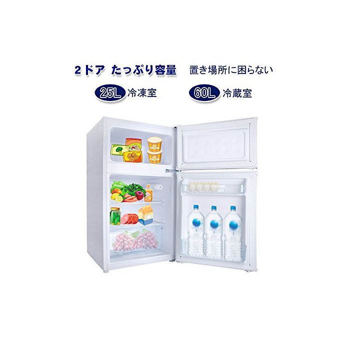【콤팩트 설계】두는 곳소에 곤란하지 않은 2도어의 냉동 냉장고입니다.냉동실 25L냉장실 60L 충분히 용량에,2L피트병이나 병도 수납에 옵니다.독신생활의 분(쪽,편)나 기숙사(관청)이나 공용 생활을 하고 있는 사람의 방에서도 대활약입니다!