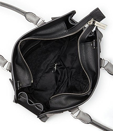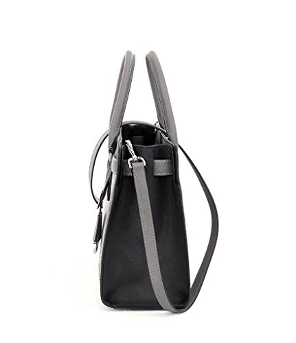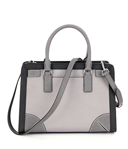 top zip closure 3 open compartments zip pocket and key fob inside adjustable strap 4.5" handle drop; 19.5" strap drop approx. 10 x 7.5 x 4"