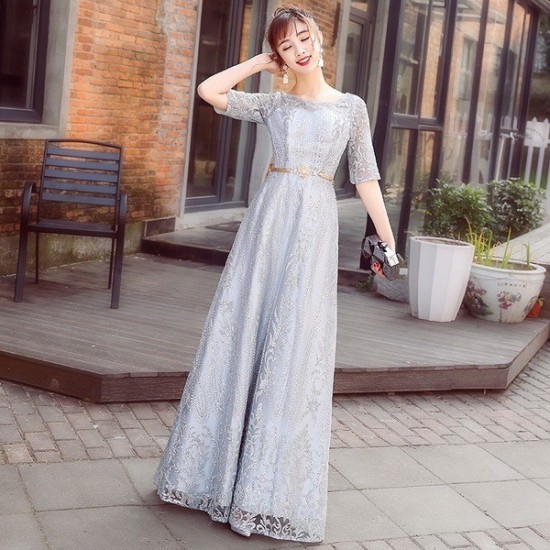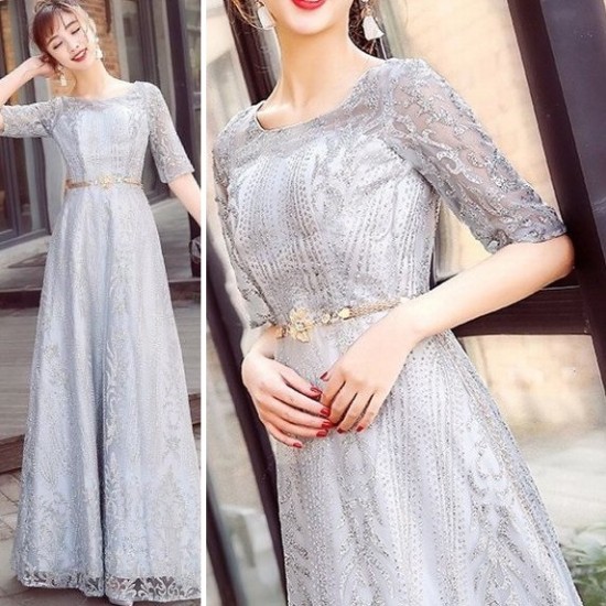 シルバーラメが華やかな、ロング丈五分袖パーティードレス。