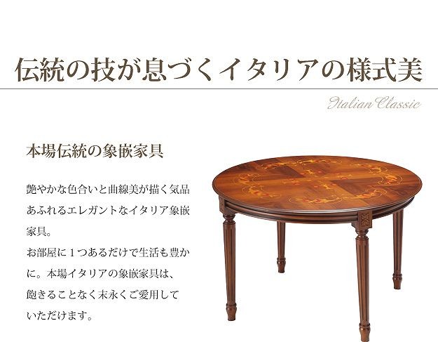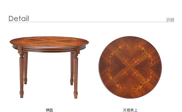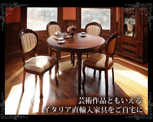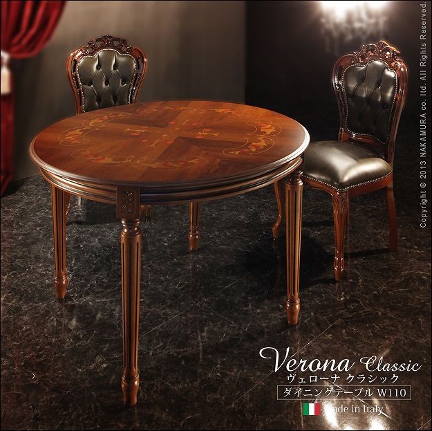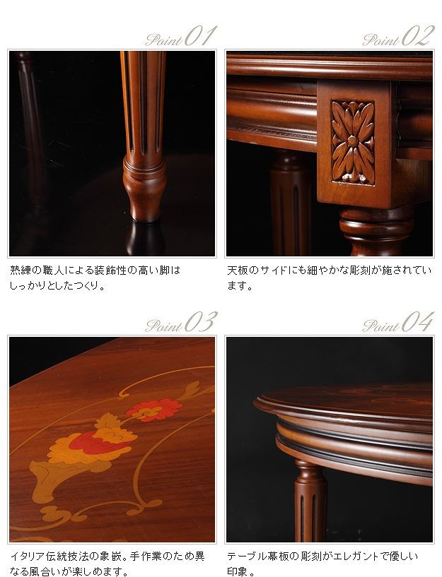 商品について:芸術作品ともいえるイタリア直輸入家具をご自宅に☆ヴェローナクラシックダイニングテーブル。天板にはイタリア伝統の職人技である美しい象嵌細工が施されています。艶やかな色合いと、優美な彫刻がお部屋をエレガントに演出します。