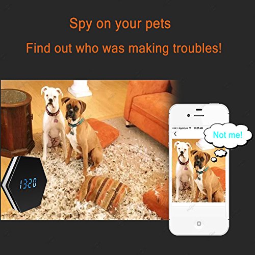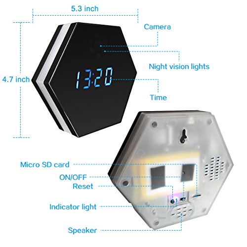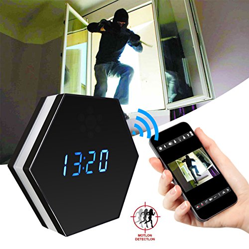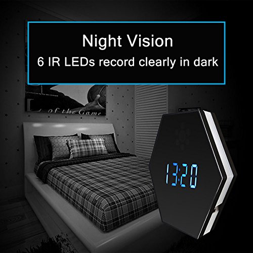 -. Feature : 1080P HD Surveillance Camera and Normal Alarm Clock: This is a security camera with normal alarm clock shape, incredible invisible and inconspicuous. Full HD 1080P Lens makes sure it's crystal enough to see what's happening in your room. / WIFI Remote Real-time Live Video View: Connect to the 2.4G Wi-Fi, there is no distance limitation for you to view or record live videos after you complete the network configuration on your Smartphone. Support PC Computer and Smartphone Tablet APP Remote View and Control. / Motion Detection: Open this function in APP (iMiniCam) first, when a movement is detected, it will take a picture and push a message to your phone. Perfect as Nanny Cam, baby monitor for home office indoor house security surveillance. / IR Night Vision: Night vision allows you to see and record even in 100% total darkness. 6pcs Invisible Infrared Lights, which can allows you to see exactly what will happen when you aren't around in your home, office, business to keep an eye on what matters most from anywhere. / 24-hour Monitoring: It doesn't let you miss any a moment of activity, easy to operate, supports SD card cycle recording up to 32GB. The device will automatically overwrites oldest files when the memory fills up, it will save a video files in per 3 minutes. (Adjustable range from 1-20 minutes)