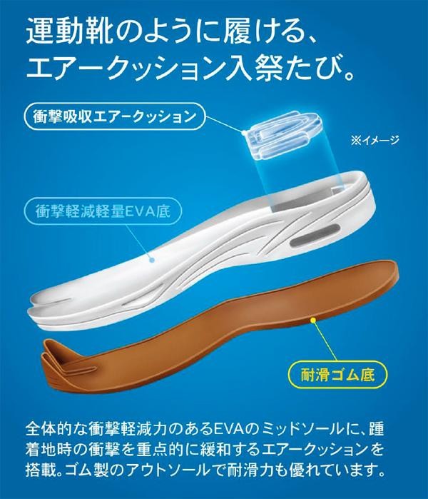 甲・かかと部の補強ステッチで、着用経過で起こる綿布のゆるみを防ぎ、密着性をキープ。これにより、履き心地の良さとフィット感が持続!!3重の衝撃吸収構造で疲れを緩和させます。 |
