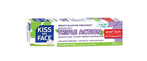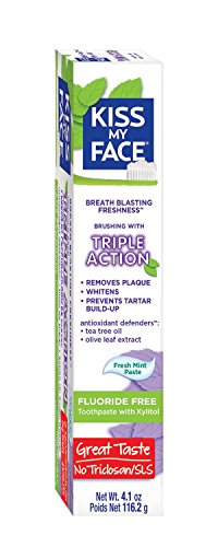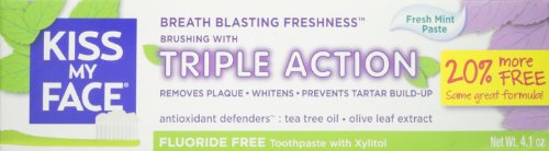 -. Binding : Misc. -. Brand : Kiss My Face -. Label : Kiss My Face Corp -. Manufacturer : Kiss My Face Corp -. ProductGroup : Beauty -. ProductTypeName : BEAUTY -. Publisher : Kiss My Face Corp -. Studio : Kiss My Face Corp -. Title : Kiss My Face Oral Care Triple Action Fluoride-Free, Fresh Mint 4.1 oz. Toothpastes (a)