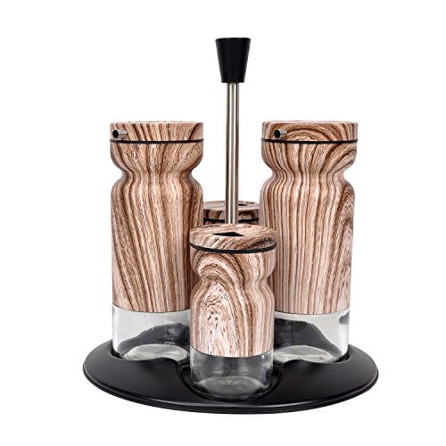-. Feature : Made of High Quality Materials for Durability and Safe Use. Stainless Steel Cover Glass Body Prevents Shattering. / Clear Glass Bottom Acts as an Refill Indicator and Quick Content Identification. Aerated Pouring Nozzle Reduce Drips and Three Options of Hole Selection for Shakers. / Intend for Oil, Vinegar, Salt and Pepper, though it's Ideal for Sugar, Spice, Herb, and Soy Sauce as well. / 4 Pieces Dining Cruet Set Included 2 Dispensers, and 2 Shakers, Complete with a Custom Carry Tray that Keeps Neatly Organized and Effortless Transfer Portability. / Available in Many Variation of Faux Print, Included Polish, Bronze, Bamboo, and Wood Grain.
