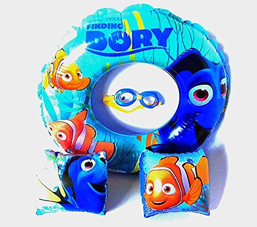 -. Binding : Toy -. Brand : Disney Pixar -. EAN : 0024606020774 -. Feature : Disney Pixar Finding Dory Swim Set / Includes: Inflatable Arms, Ring, Goggles / Goggles have comfortable elastic adjustable straps / Easy to inflate floaties / 3 years + -. IsAdultProduct : 0 -. Label : Disney -. Manufacturer : Disney -. ProductGroup : Toy -. ProductTypeName : TOYS_AND_GAMES -. Publisher : Disney -. Studio : Disney -. Title : Disney Pixar Finding Dory Inflatable Ring Arm Floats and Goggles -. UPC : 024606020774