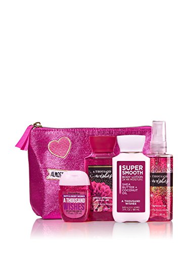 -. Binding : Misc. -. Brand : Bath & Body Works -. EAN : 0654554227668 -. Feature : Merry On-the-Go Gift Set A THOUSAND WISHES / Make someone's Christmas merry & bright everywhere she goes! Convenient travel sizes of our super-lathering Shower Gel, hydrating Body Lotion and long-lasting Fine Fragrance Mist (3 fl oz each) keep skin soft & beautifully scented, while our NEW PocketBac (1 fl oz) leave hands clean & refreshed. Plus, a glittering cosmetic bag with a fun message is the perfect way to stay merry & bright all season long! / A festive blend of sparkling champagne, crystal peonies & almond crème / Cosmetic Bag measures 7.5"L x 3"W x 6"H. Zip closure / Online Only -. IsAdultProduct : 0 -. Label : Bath & Body Works -. Manufacturer : Bath & Body Works -. MPN : A Thousand Merry On-the-Go Gift Set -. PackageQuantity : 1 -. PartNumber : A Thousand Merry On-the-Go Gift Set -. ProductGroup : Beauty -. ProductTypeName : BEAUTY -. Publisher : Bath & Body Works -. Studio : Bath & Body Works -. Title : Bath & Body Works A THOUSAND WISHES Merry On-the-Go Gift Set Trio Travel Size Gift Set -. UPC : 654554227668
