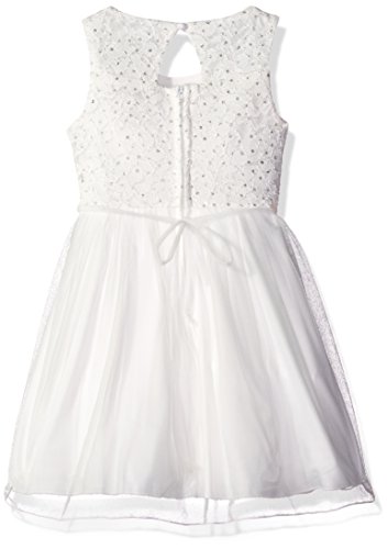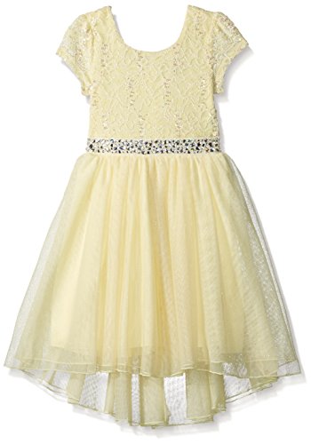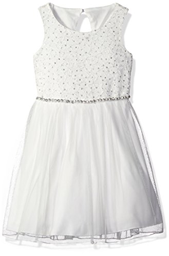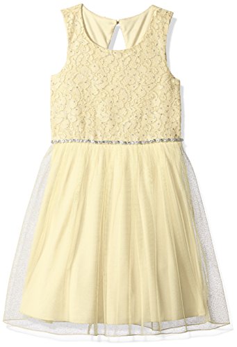 Knee length sleeveless glitter lace to mesh with a round neck and jeweled waist trim