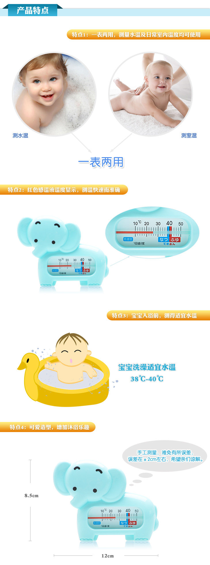 Bath water temperature measurement can be used for baby bath product characteristics, it can also be used usually when the thermometer to measure the temperature. Baby bath when the water temperature should normally be controlled at 40 ℃, bath thermometer can float on the water, you can accurately indicates the instant when the temperature of the water bath to prevent the baby was burned or cold because the water temperature is too low.
