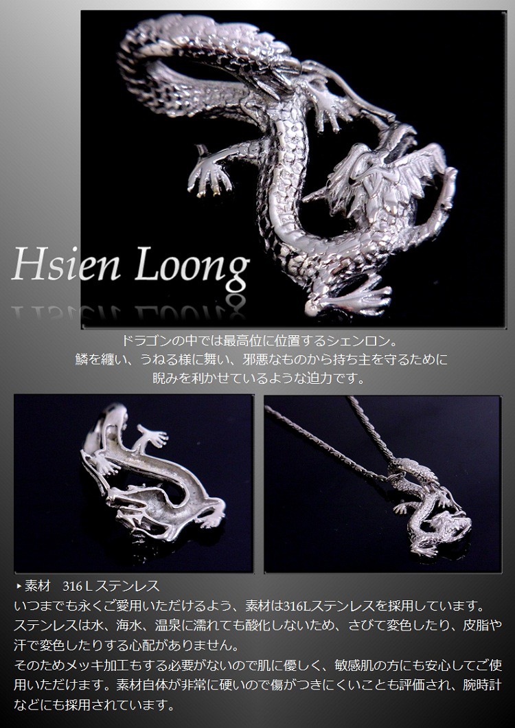 シェンロン力のあるドラゴンがうねる様に舞い、持ち主を邪悪なものから守るために睨みを利かせているような迫力です。縦38mm×幅26mm×厚み10mmチェーンを通す部分 4mm■素材:サージカルステンレス肌に優しく、敏感肌の方にもお勧めの素材です。皮脂や汗、水、海水、温泉などで濡れてもほとんど変色せず、傷にも強いことから、腕時計の素材としてもよく使われています。