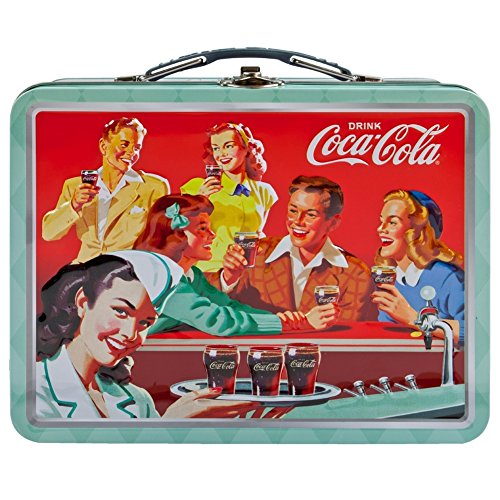 This red and pink tin lunch box with sage green trim has a vintage style Coca Cola ad on the front and back. The sides read "have a coke" below a filled soda glass. A gray plastic handle and standard metal latch make this a durable and retro style storage solution.