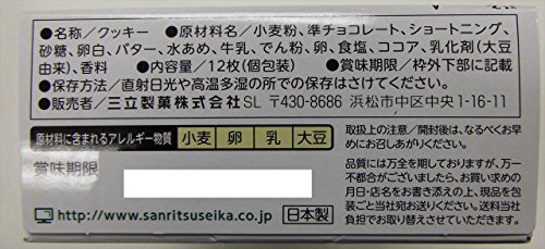 原材料:小麦粉、準チョコレート、ショートニング、砂糖、卵白、バター、水あめ、牛乳、でん粉、卵、食塩、ココア、乳化剤(大豆由来)、香料
