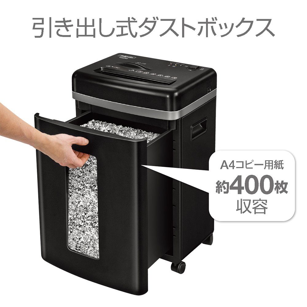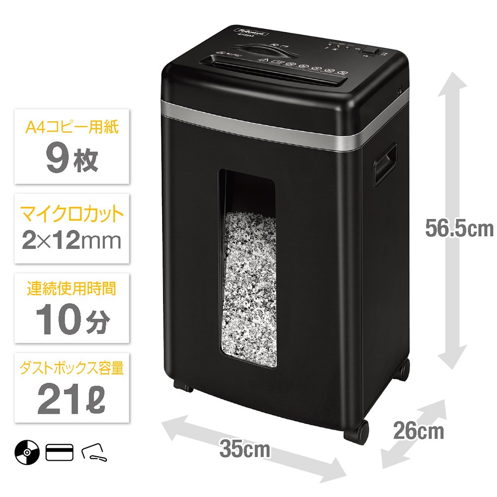 A4用紙を1度に最大9枚投入可能 セキュリティー性が高い2×12mmのマイクロカット クズ箱容量21L(A4用紙約320枚分) *推奨クズ袋30L以上 オートリバース機能付:能力以上の枚数を投入すると、自動でモーターが逆回転、押し戻して紙詰まりを防ぐ。 連続使用時間10分