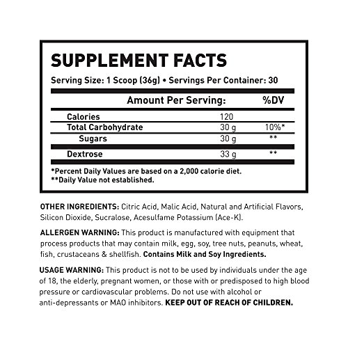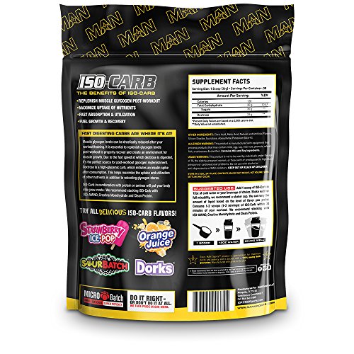 ReleaseDate : 2016-12-31 Studio : MAN Sports Publisher : MAN Sports Binding : Health and Beauty Product Description ISO-Carb is a pure dextrose powder, with 33g of dextrose yielding 30g carbs. It's a throwback to simple, effective carbohydrate supplementation. Dextrose is a simple (sugar) carb. Being a sugar based carbohydrate, dextrose digests extremely fast making it the perfect source for post-workout muscle glycogen replenishment. Muscle glycogen levels can be drastically reduced after your workout/training. It is essential to replenish glycogen levels post-workout to properly recover and create an environment for muscle growth. Dextrose is a high-glycemic carb, which also initiates an insulin spike after consumption. This helps maximize the uptake and utilization of other nutrients in additional to rebooting glycogen stores. 0