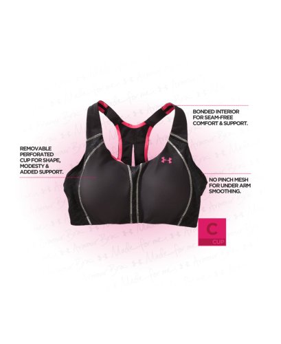 Bonded seams eliminate painful rubbing and chafing. Removable, molded cups deliver modesty, support, and a streamlined silhouette. Straps built with UA's SuperStretch technology that eliminates digging. Ultra-soft, sturdy fabric feels smooth and comfortable against your skin. Signature UA Compression fabric lets you concentrate on your moves, not what's moving. Next generation power sling construction cradles for superior support that stays put. 4-way stretch construction improves range of motion and dries faster. Signature Moisture Transport System wicks sweat away from the body. Classic pull-over racer back with soft hook and eye closure for customized fit. Strategic mesh venting for enhanced ventilation. Built specifically for C-cup fit and performance. Nylon/Elastane. Imported.Feature