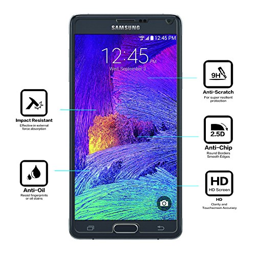 -. Feature : 0.26mm tempered glass screen protector designed for Samsung Galaxy Note 4 ONLY, perfect cut and fit for your phone's screen, 2.5D round edge provides more comfortable handle feeling than the right angle edge, and will never hurt your fingers / One-push super easily installation: Precise laser cut tempered glass made with polished, rounded edges, automatically attach to the screen smoothly, hassle-free and bubble-free. No residue when removed, can repeatable installation / Featuring maximum protection: 99.99% HD Clarity and Touchscreen Accuracy, Oleophobic screen coating magically resists oils and reduces annoying fingerP.R.Ints, against dirt and dust. Explosion-proof 9H Hardness Scratch-resistant screen protector can effectively protect your Samsung Galaxy Note 4 from unwanted scuffs and scratches by knife, keys and some other hard substances / Lifetime no-hassle warranty provides easy lifetime protection for your tempered glass screen protector / Online video tutorials and detailed Instructions on how to correctly install your screen protector