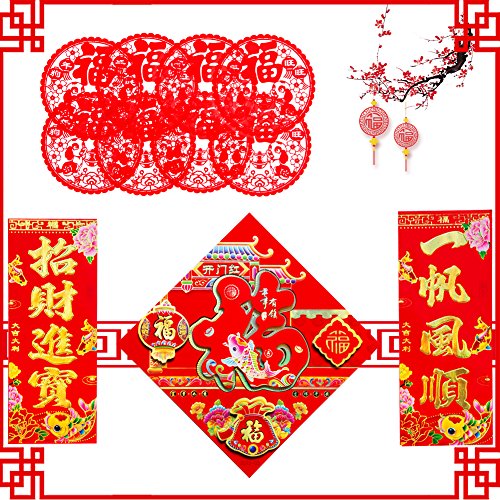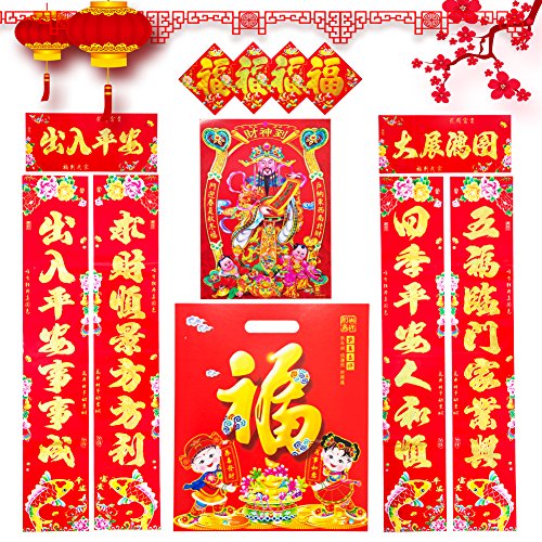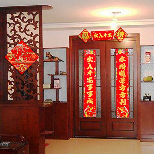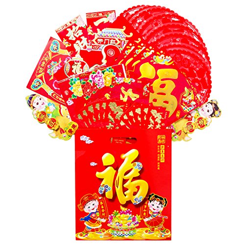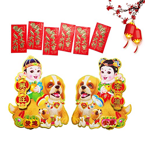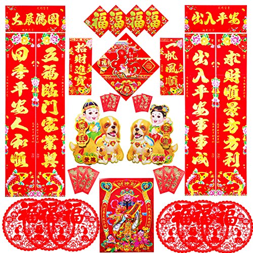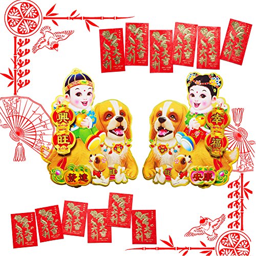 [Delux Couplet Set]Package Including 31pcs—Chinese Couplets with banner (more than 100cm height) x 2; Papercuts (26cm) x 8; Red Envelopes x 12(17x9cm of 6^^12x8cm 0f 6);Fu Character Sticker x 4;Chinese Zodiac Dog stickers( random ) x 2; Fu bag (42x36cm) x 1; Three-dimensional Fu Sticker x 1(34x48cm); Mammon character sticker x 1