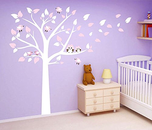 ufengke Large Tree Cute Owls Wall Decals, Children's Room Nursery Removable Wall Stickers Murals White And Pink