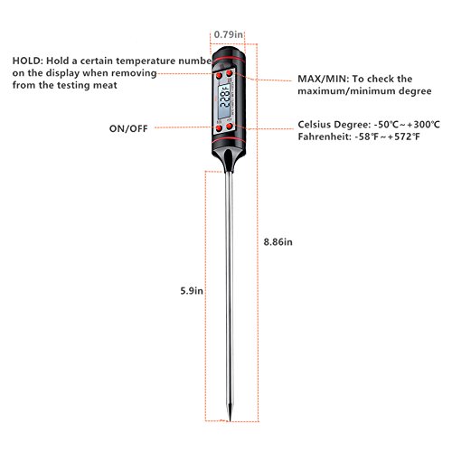 - Thermometer Range: 14°F ~ 482°F (-10°C ~ 250°C) - Accuracy: ± 1°C (-10°C ~ 100°C), ± 2°C (Above 100°C) - Powered by 2 AAA batteries (Not Included) - Probe Material: 304 Stainless Steel - Probe Length: 1m/39.4 inch - Time Max: 59min59s - Package Weight: 160g/5.64OZ - Package Dimensions: 24 * 12 * 3 cm /9.45 * 4.72 * 1.18inch