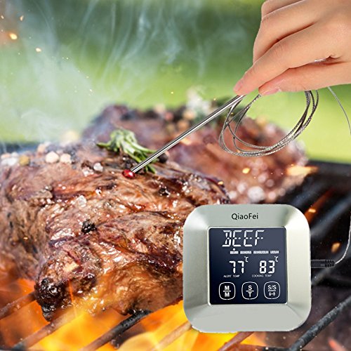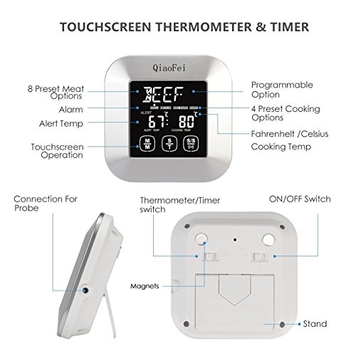 - Thermometer with large clear digtial screen: temperature display(Current Temp and Target Temp), cooking time display - 8 Meat Type Selection: Veal, Hamburger, Pork, Turkey, Chicken, Fish, Beef, Lamb - 4 Preset Temperatures for Rare, Medium Rare, Medium, and Well - Timer: Time alarm function - Temperature Display Selection: °C/°F