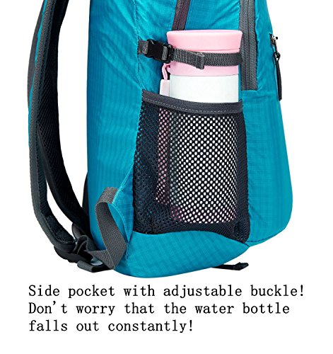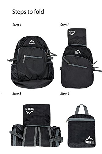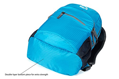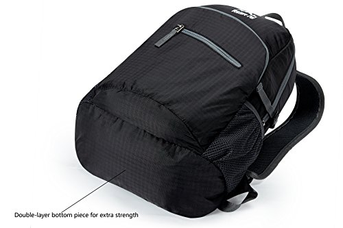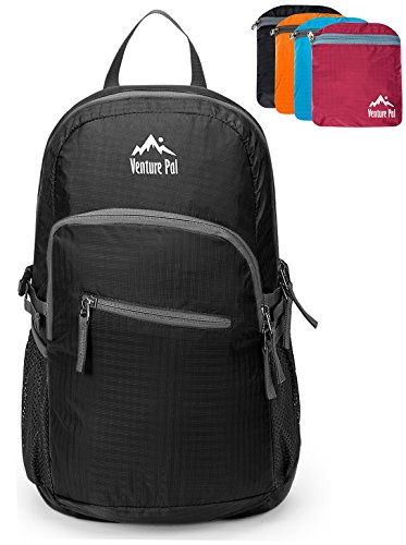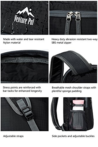 -. Feature : DURABLE. This Venture Pal Backpack is made with high quality tear and water resistant material, provides extra strength and long-lasting performance with the lightest weight possible. The extra strength provided by the double-layer bottom piece makes it very convenient to carry more load on your journeys. Heavy duty two-way SBS metal zippers across the backpack are convenient to operation on whichever side you prefer. Longevity is further enhanced by bar-tacks at major stress points. / COMFORTABLE. Breathable mesh shoulder straps with plentiful sponge padding help relieve the stress from your shoulder. The length of the shoulder straps is adjustable. / MULTI COMPARTMENTS and KEEP THINGS ORGANIZED. This backpack features one main zipped compartment, two zipped front pockets and two side pockets. The main compartment provide enough room (20 Liters) no matter if it's a day trip or a week long journey. Two separators and a small pouch in the main compartment are convenient enough to help you further organize things and hold small accessories. Two side pockets with adjustable buckles are good for holding water bottles and umbrellas. / LIGHTWEIGHT(0.5LB) and ROOMY(20Liters). A true space saver. Fold the backpack into its own pouch for storage (no more excess baggage fees), and unfold it when you reach your destination. To avoid overweight charge, simply unfold from your checked bags and use it as a carry on for your excess baggage. / COMPACT. Folds into zipped inner pouch to fit anywhere, and unfolds from pouch to backpack in seconds. A must have for every trip.