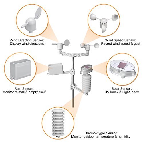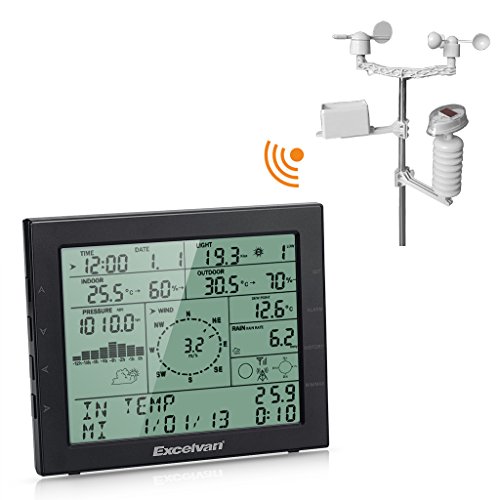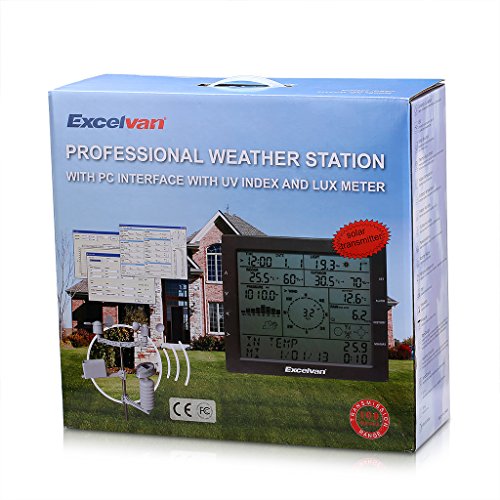 Studio : Excelvan Publisher : Excelvan Product Description Outdoor data: Transmission distance in open field : 328ft max Transmission frequency: 433MHz Temperature range: -40℃ to 60℃ Accuracy: /-1℃ Resolution: 0.1 °C Measuring range rel. humidity: 10%~99% Accuracy: /-5% Rain volume display: 0-9999mm Accuracy: /-10% Resolution: 0.3mm(if rain volume<1000mm), 1mm(if rain volume>1000mm) Wind speed: 0-50m/s(0-100mph) Accuracy: /-1 m/s(wind speed<5m/s), /-10%(wind speed>5m/s) Light: 0-300k LUX Accuracy: /-15% Measuring interval thermo-hygro sensor: 48 sec Measuring interval UV sensor: 60 sec Measuring imteral light sensor: 60 sec Water proof level: IPX3 Indoor data: Pressure/temperature: 48 sec Indoor temperature range: -10℃ to 60℃ Accuracy: /-1℃ Resolution: 0.1 °C Measuring range rel. humidity: 10%~99% Resolution: 1% Measuring range air pressure: 300hPa-1100hPa(8.85-32.5 inHg) Accuracy: /-3hPa under 700-1100hPa Resolution: 0.1hPa(0.01 inHg) Alarm duration: 120 sec 0