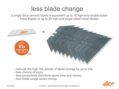 - 1 Slice Ceramic Blade = Up to 20 Metal Blades = Less Blade Changes = Less $$$ = Less Downtime = Less injuries + Simple No Tool Blade Change (Replacement SKU# 10404 or 10408)