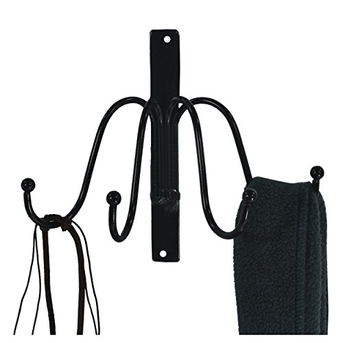 - Feature : A wall-mounted hanging rack with a classic black finish. / Features 4 elegantly curved metal hooks that are perfect for hanging coats, scarves, hats, handbags, hair dryers, and anything else you want to keep close at hand. / Includes a set of screws, allowing you to easily mount this hanging rack in any room. / Metal construction with black finish. / Approximate Dimensions: 6.5" W X 5.75" H X 3.75" D.