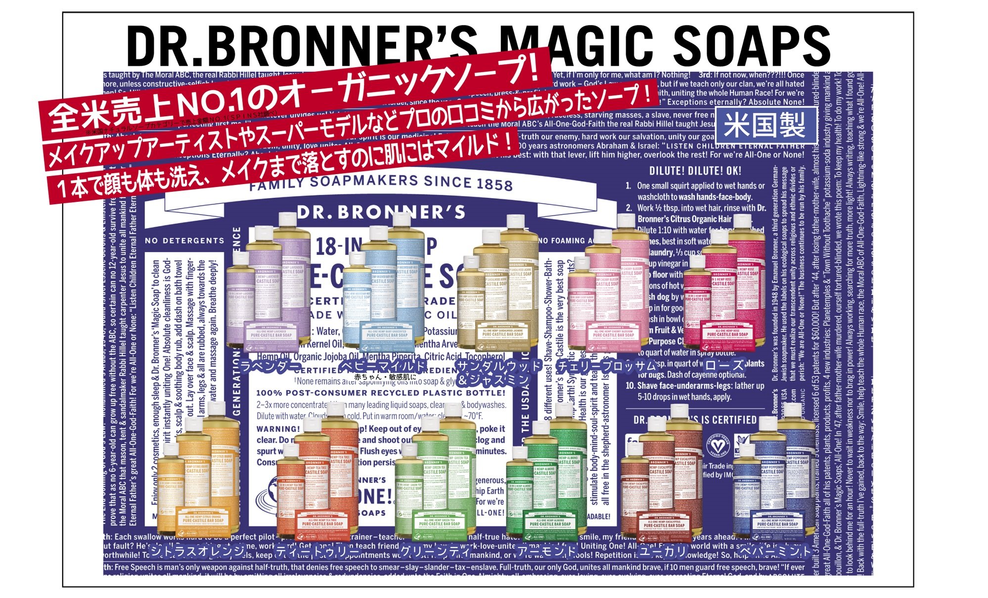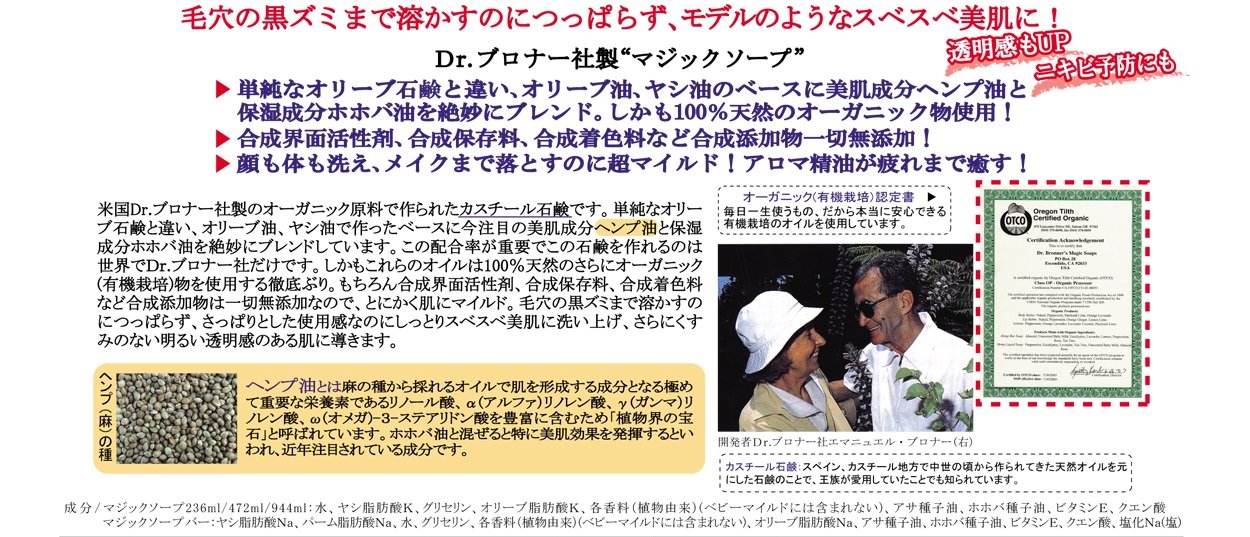 In 1929 Emmanuel Bronner brought the US's unique prescription of high-quality liquid soap and bar soap, and in 1948 he began making magic soap with the current prescription.