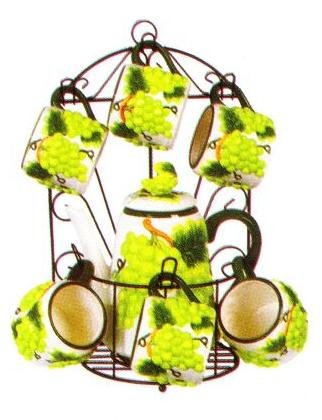 Product Description Take a look at this BRAND NEW and very beautiful Green Grape Tea Set with Iron Rack. This is truly a gorgeous set with a beautiful design! Each piece is very very nice, detailed, and vibrantly colored. Each piece (other than the iron rack) is designed with 3-Dimensional Green Grape Bunches.