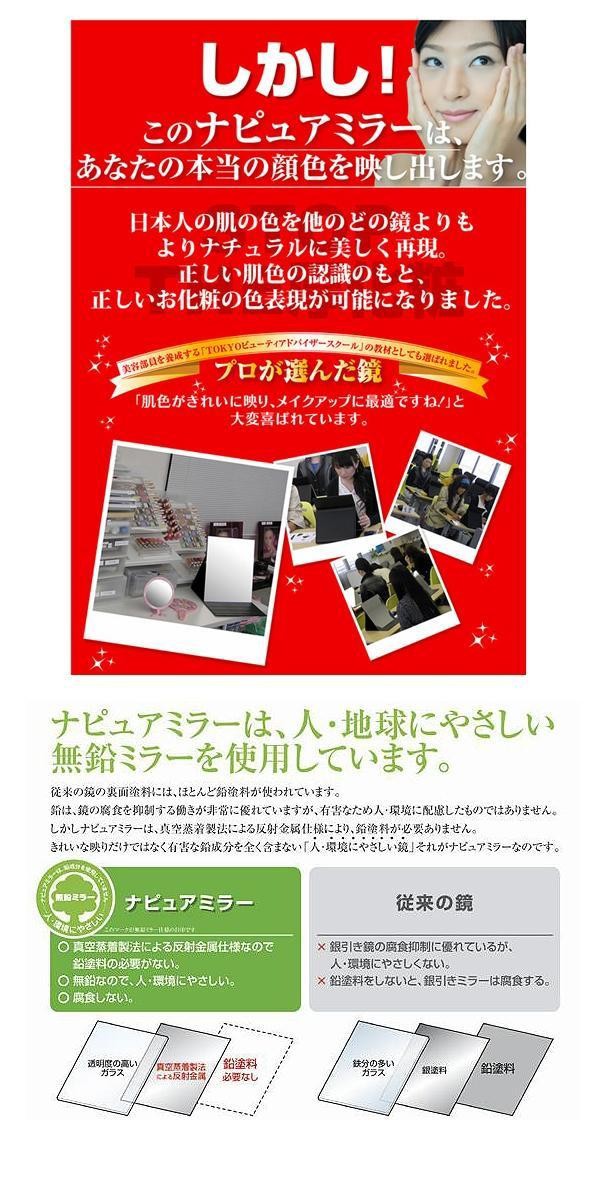 | プロの美容部員が愛用するプロモデル折立ミラーシリーズからスモーキーピンクのLLが登場しました。ファンデーションを合わせたり、ポイントメイクをするのに最適な鏡です。ナピュアミラーは特許取得ミラーです。 |