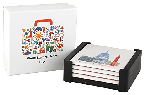 Planet Ethnic World Explorer (USA - Washington DC, New York, Las Vegas, San Francisco) Ceramic Coaster Set (4 coasters, each almost 4 X 4 inches) with matching wooden coaster holder and nice gift box