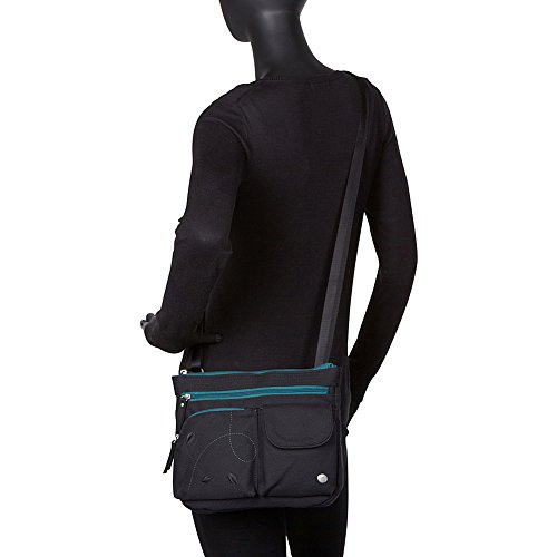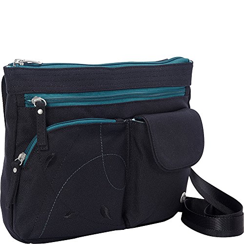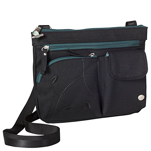 -. Feature : Secure zip closure / 2 interior pockets (1 zip and 1 slip and 5 card slots / 1 card slot has protective RFID blocking technology / Interior key fob / Removable zippered pouch