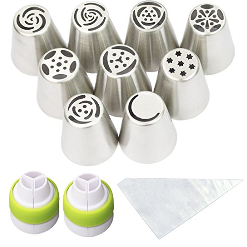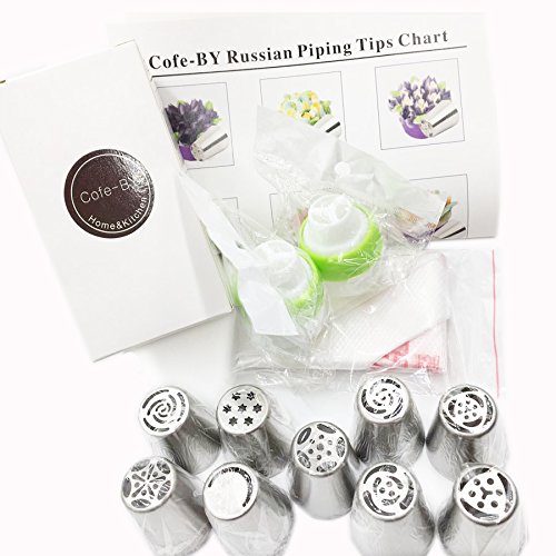 Cofe-BY Russian Piping Tips Cake Decorating Kits 21-Pcs Set for Home Baking DIY Tool Rose Tulip Icing Piping Nozzles Tip Large Size ( 9 Russian Tips 10 Disposable Pastry Bags 2 Tri-Color Coupler)