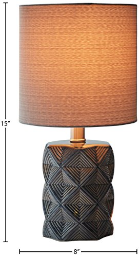 Geometric shapes in shades of grey and black give this lamp's ceramic base a modern feel, while a fabric drum shade, also in grey, gives it a classic hint. This lamp will add pleasing ambient light to transitional or modern décor.