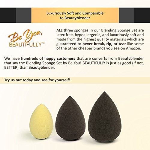 -. Feature : ONE OF THE BEST KEPT SECRETS OF PROFESSIONAL MAKEUP ARTISTS - Now you can finally have the gorgeous, flawless look from a Professional Makeup artist right at home... even if you only have 10 mins to do your makeup in the morning. Stop applying makeup with your hands and fingers and get better results in less time with the Blending Sponge Set by Blend Me! BEAUTIFULLY! / CONTOUR, HIGHLIGHT, AND BLEND LIKE NEVER BEFORE - The super-fine texture of all three of the Blending Sponges makes it impossible to apply makeup unevenly and at the same time, allows for a beautiful, flawless finish. After dampening the sponge, contouring cheekbones will never be easier or faster to do and blending your foundation will give you results you thought only the professional makeup artists at MAC could do! / LATEX FREE, HYPOALLERGENIC, LUXURIOUSLY SOFT - ALL three sponges in our Blending Sponge Set are latex free, hypoallergenic, and luxuriously soft. We've worked with the best possible manufacturers to design the ultimate Blending Sponges from the highest quality materials which are guaranteed to never break, rip, or tear like some of the other cheaper brands you see on Amazon. Be confident that when you have a Blend Me! BEAUTIFULLY Sponge in your hand, you have the best quality possible. / PERFECT PRECISION FOR AN AIRBRUSHED FINISH - As brushes can sometimes cause an uneven skin tone from excess makeup sitting on your skin, our Blending Sponges sheer out your foundation to create the most amazing "airbrushed" finish with incredibly even application all-over. Once a difficult task, stippling becomes effortless and it's now easier than ever to get into small spaces, hard to reach areas, and even fine lines. / BACKED BY OUR LIFETIME MONEY-BACK GUARANTEE - All Blend Me! BEAUTIFULLY products are backed by our Lifetime Money-Back Guarantee. If for any reason you're not happy with your order, let our friendly Customer Service team know and we'll give you a full, no questions asked refund of your entire order. That's how much we stand behind our products and when you try them, we know you will, too.