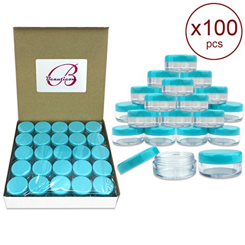 (Quantity: 100 Pieces) Beauticom 5G/5ML Round Clear Jars with TEAL Sky Blue Lids for Scrubs, Oils, Toner, Salves, Creams, Lotions, Makeup Samples, Lip...