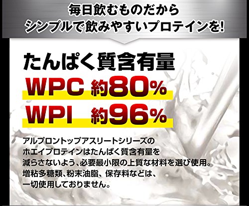 -. Feature : 優れたたんぱく質含有量。味も豊富です♪ / たんぱく質含有量を減らさないように、出来るだけ簡素化したプロテインで増粘多糖類、粉末油脂、保存料などを使用しておりません。 / 吸収速度の速いホエイプロテインはアスリートたちの圧倒的な支持を得ています。 / アルプロンのトップアスリートシリーズプロテインは優れたたんぱく質含有量。 / 詳しくはトップアスリートシリーズで検索!http://top-athlete.jp/