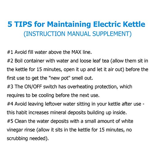 Avoid Leaving Leftover Water Sitting in Your Kettle after Use - this habit increases mineral deposits building up inside, make sure empty your electric kettle thoroughly after every use.
