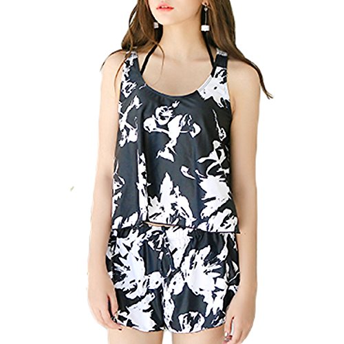 -. Title : adelphos 水着 タンキニ ビキニ トップス ショートパンツ 四点セット ホルターネック バンドゥブラ レモンパッド付き 8405 (M, ブラックフラワー)