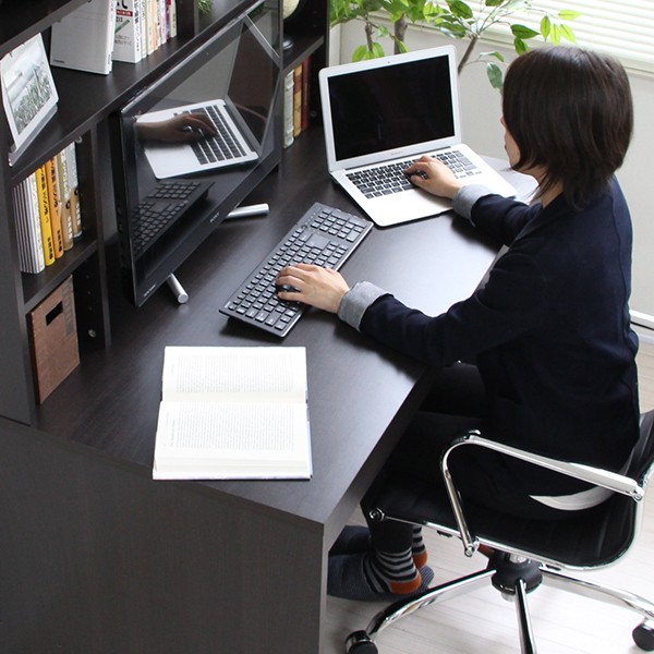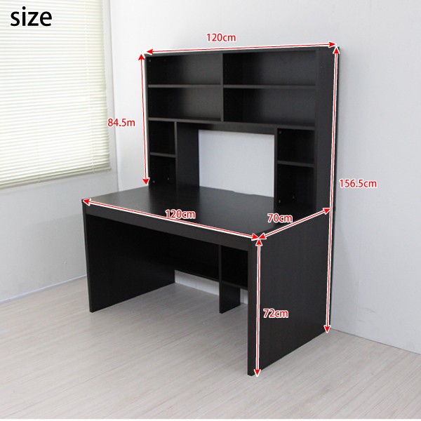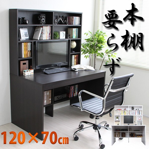 ■幅:120cm、奥行70cm、高さ156cmの書棚付きパソコンデスク。
