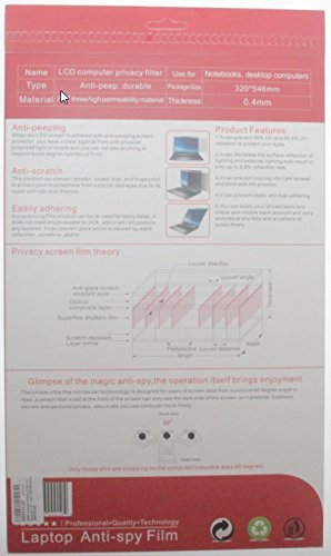 - Feature : Privacy filter with a screen view-able area of 60 degrees / Decrease surface reflection of lighting and external lighting up to 5.8% / Prevents mapping into light spread and blink with AG process / Prevents 96% UV and 99.9% LF-radiation to protect your eyes / Anti Scratch, Anti Peeping, Easily adhering